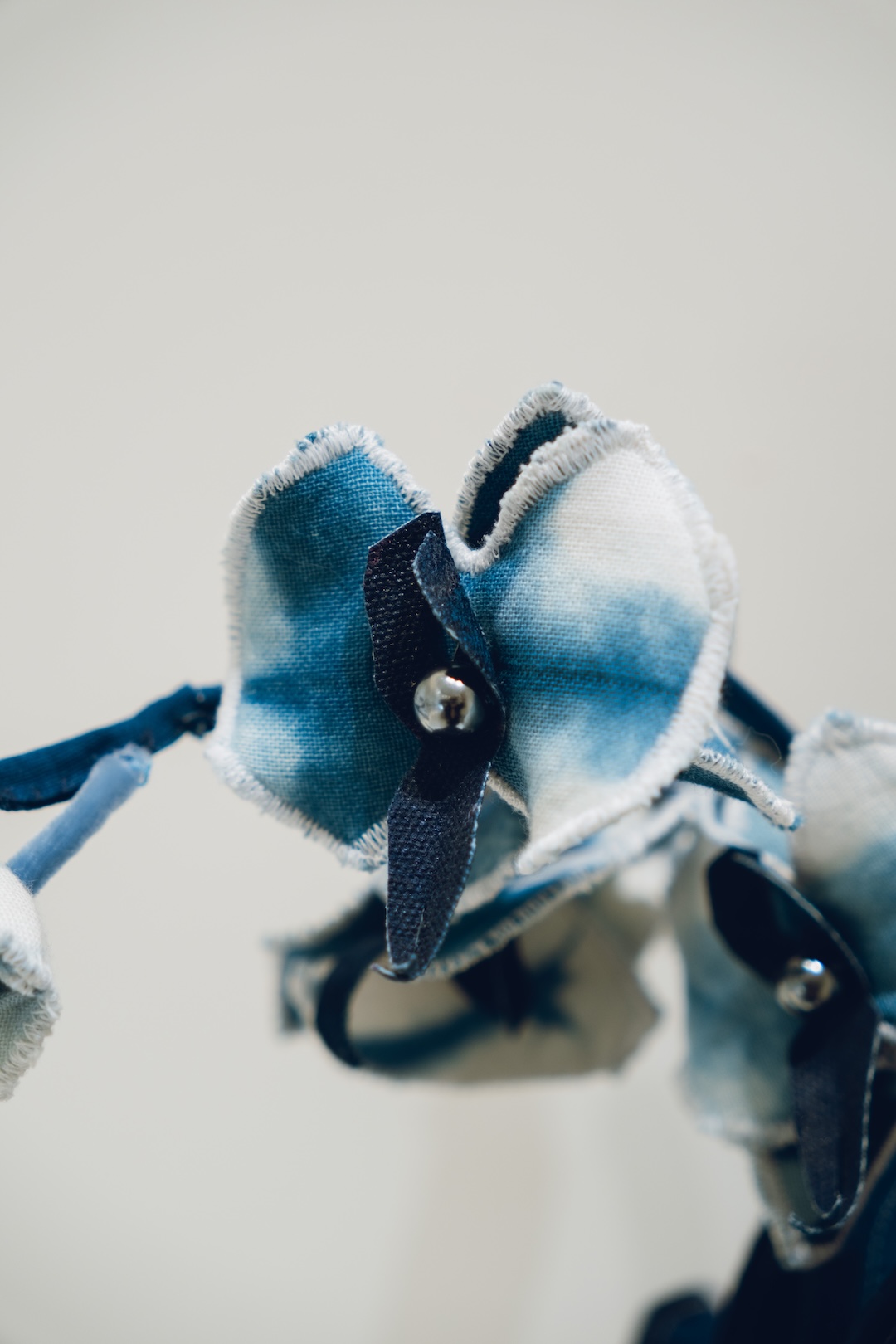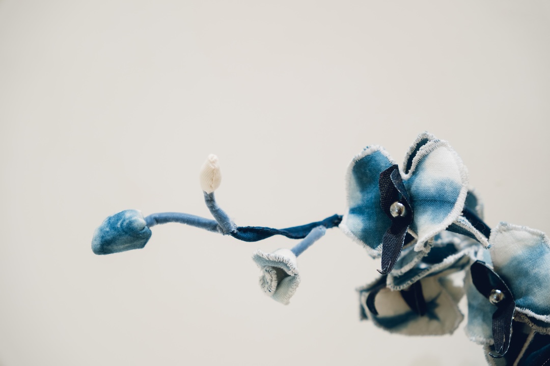 Fabric, indigo dye, synthetic cotton, beads, copper, ceramic pot, mixed media