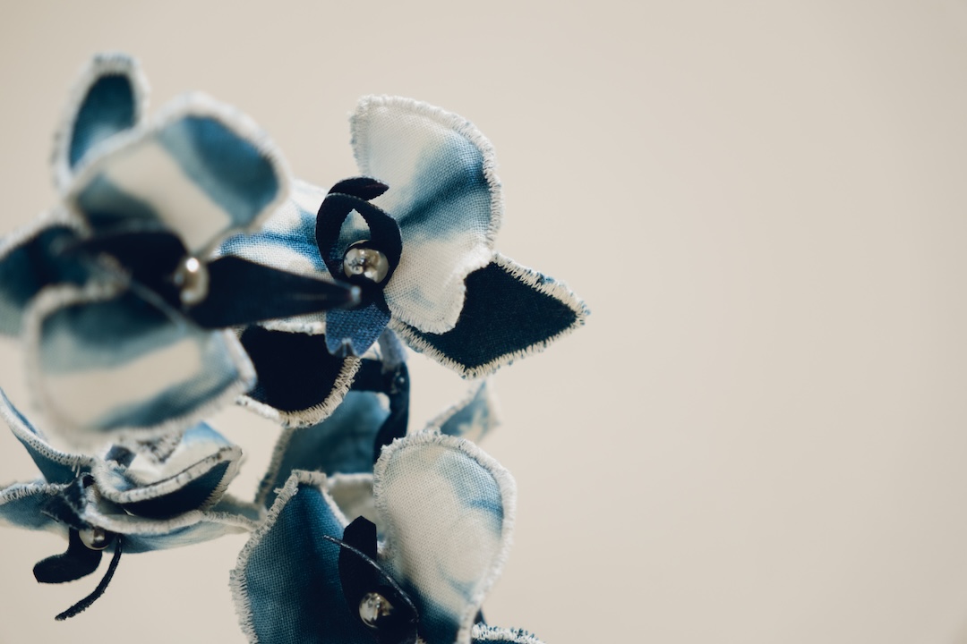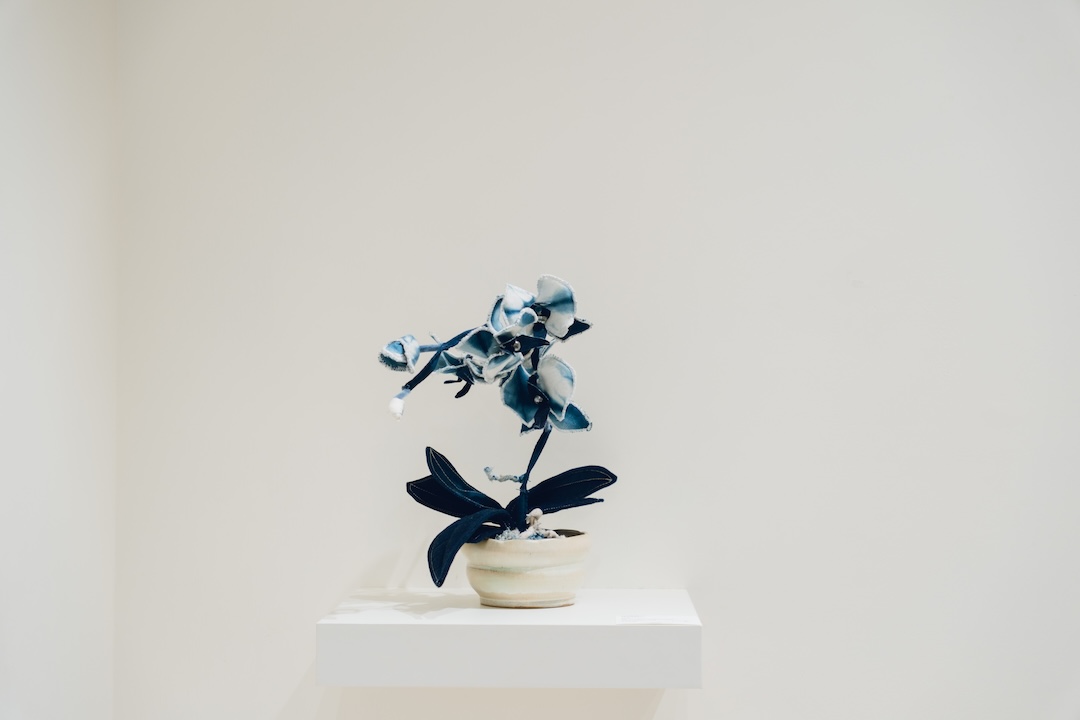 Fabric, indigo dye, synthetic cotton, beads, copper, ceramic pot, mixed media