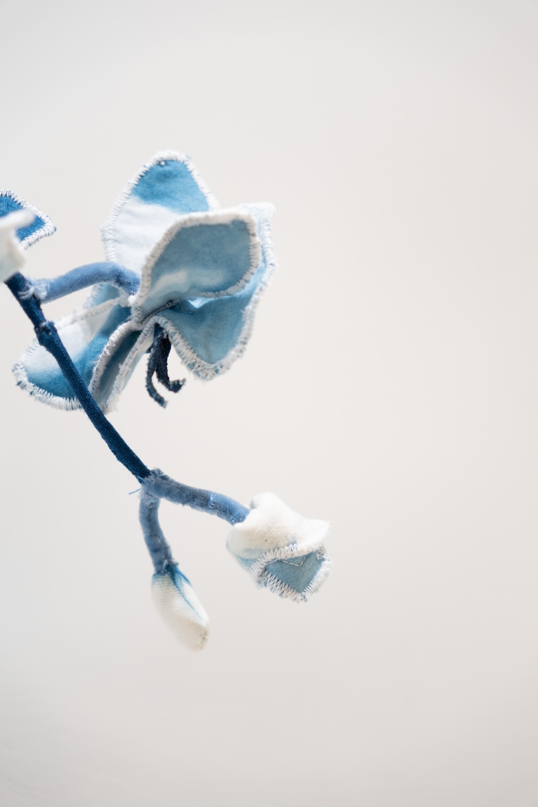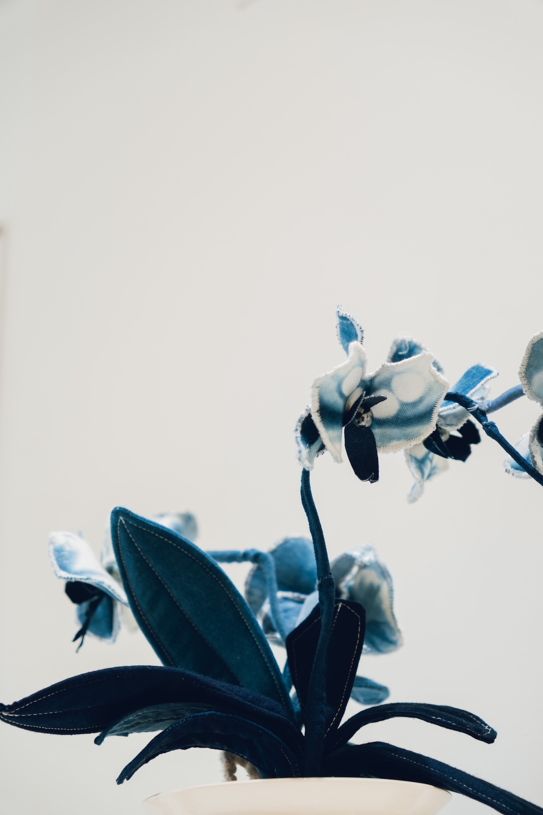 Fabric, indigo dye, synthetic cotton, beads, copper, ceramic pot, mixed media